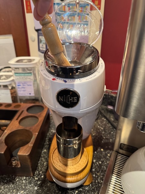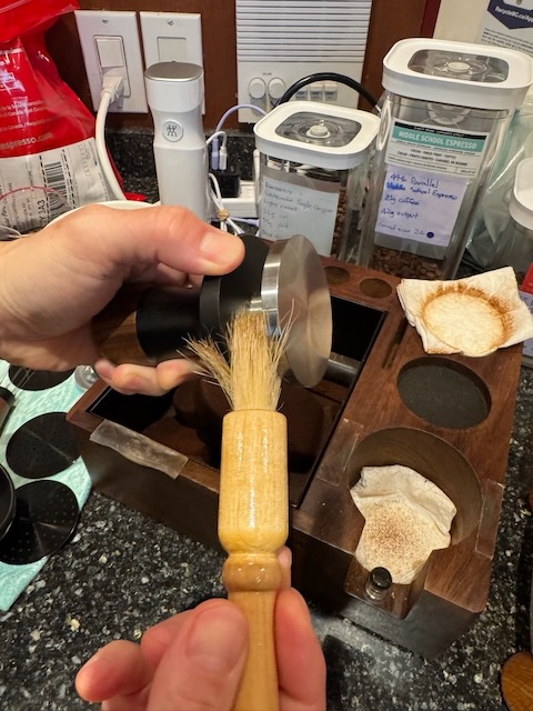 Wash all accessories with dish detergent and place to dry. Wipe counter area around grinder and tamp box with damp cloth