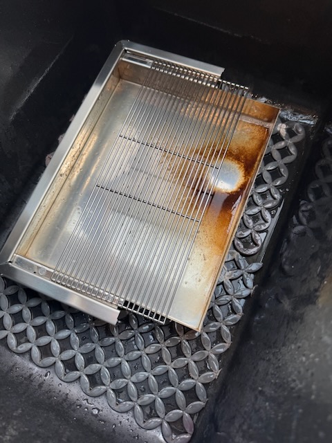 Remove the water tray and dump all contents into sink. Wash water tray, dry off front/sides/bottom, then replace the tray
