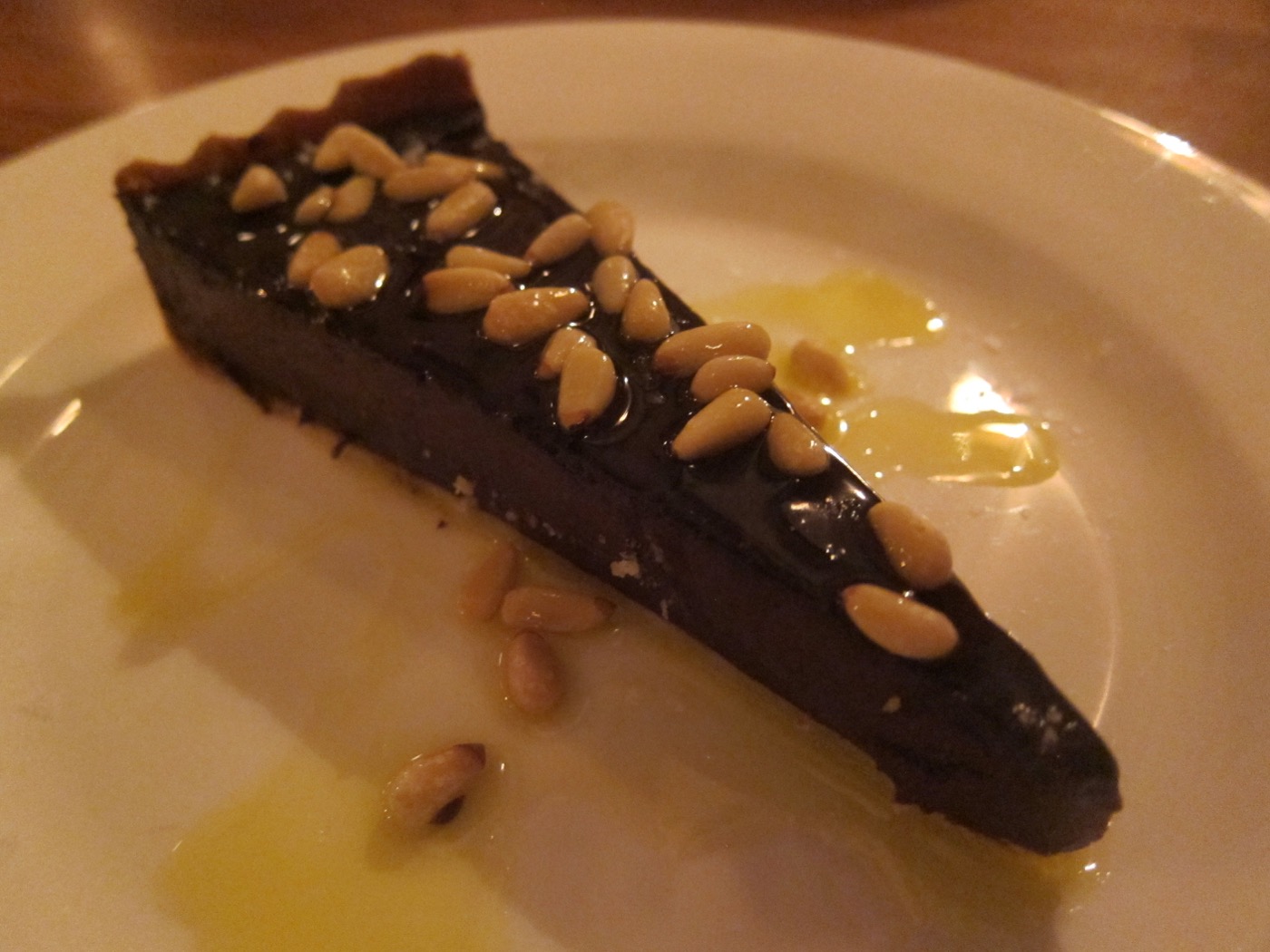 Chocolate tart, olive oil, sea salt, pinenuts.